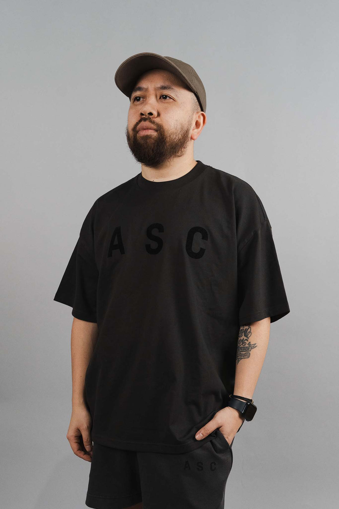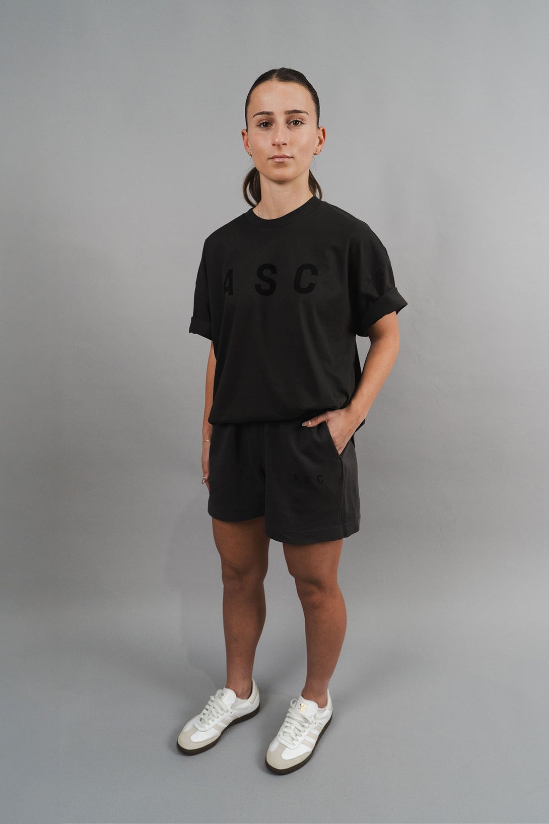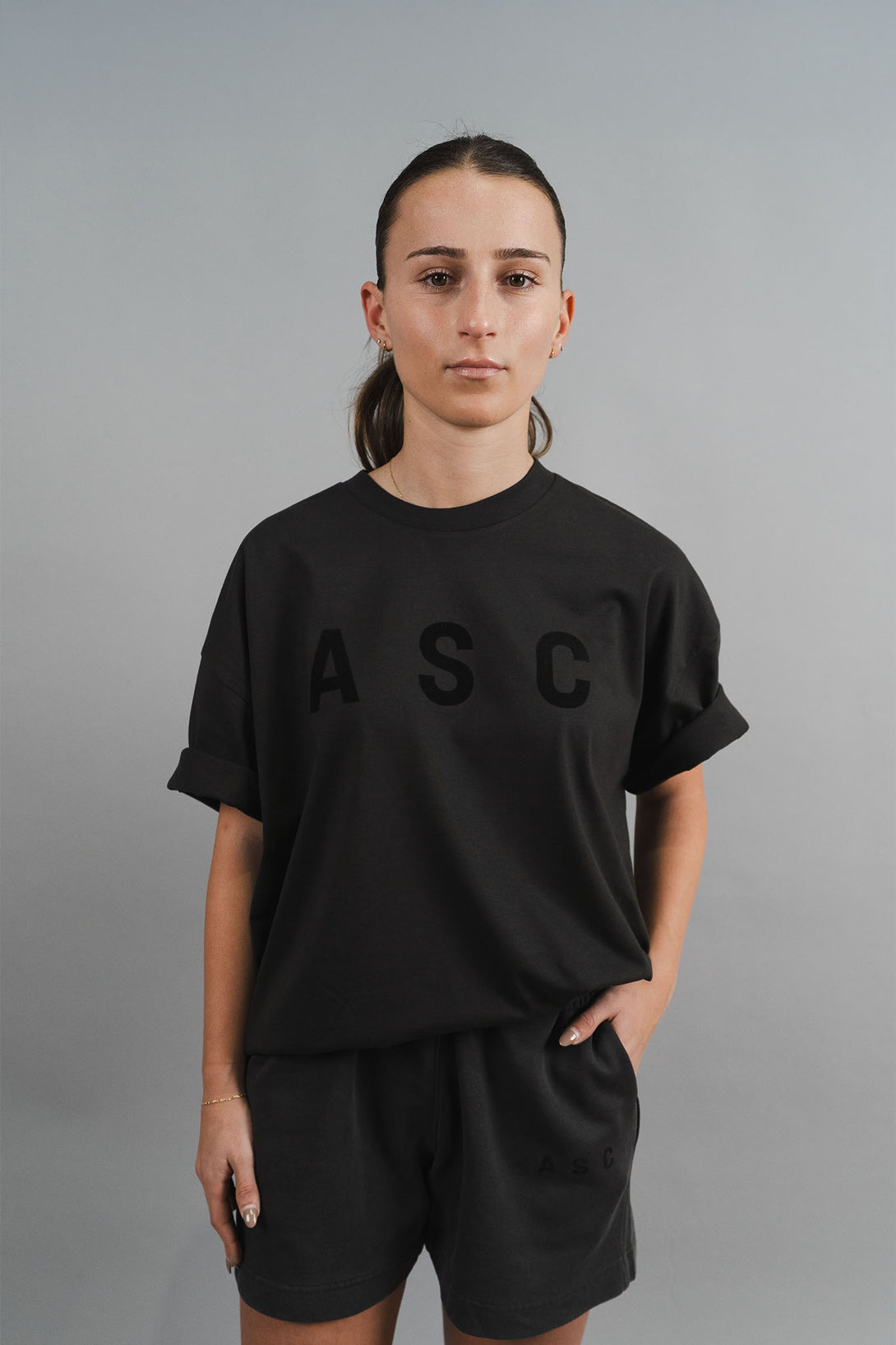 Oversized fit with drop shoulders, neck ribbing, cropped full length, shoulder to shoulder tape, double needle hems