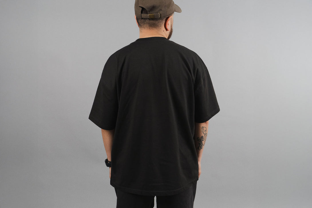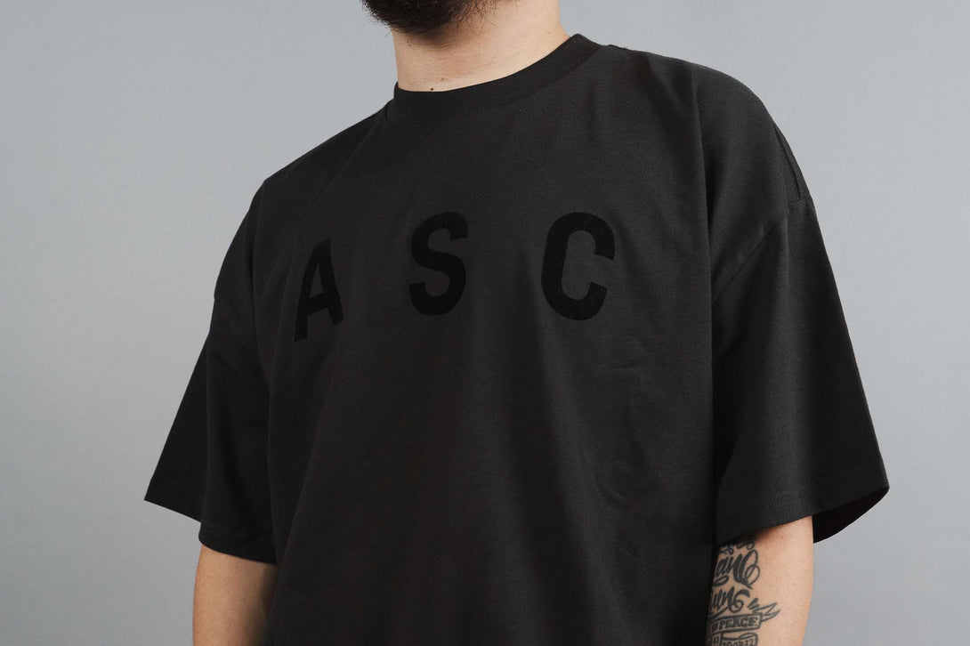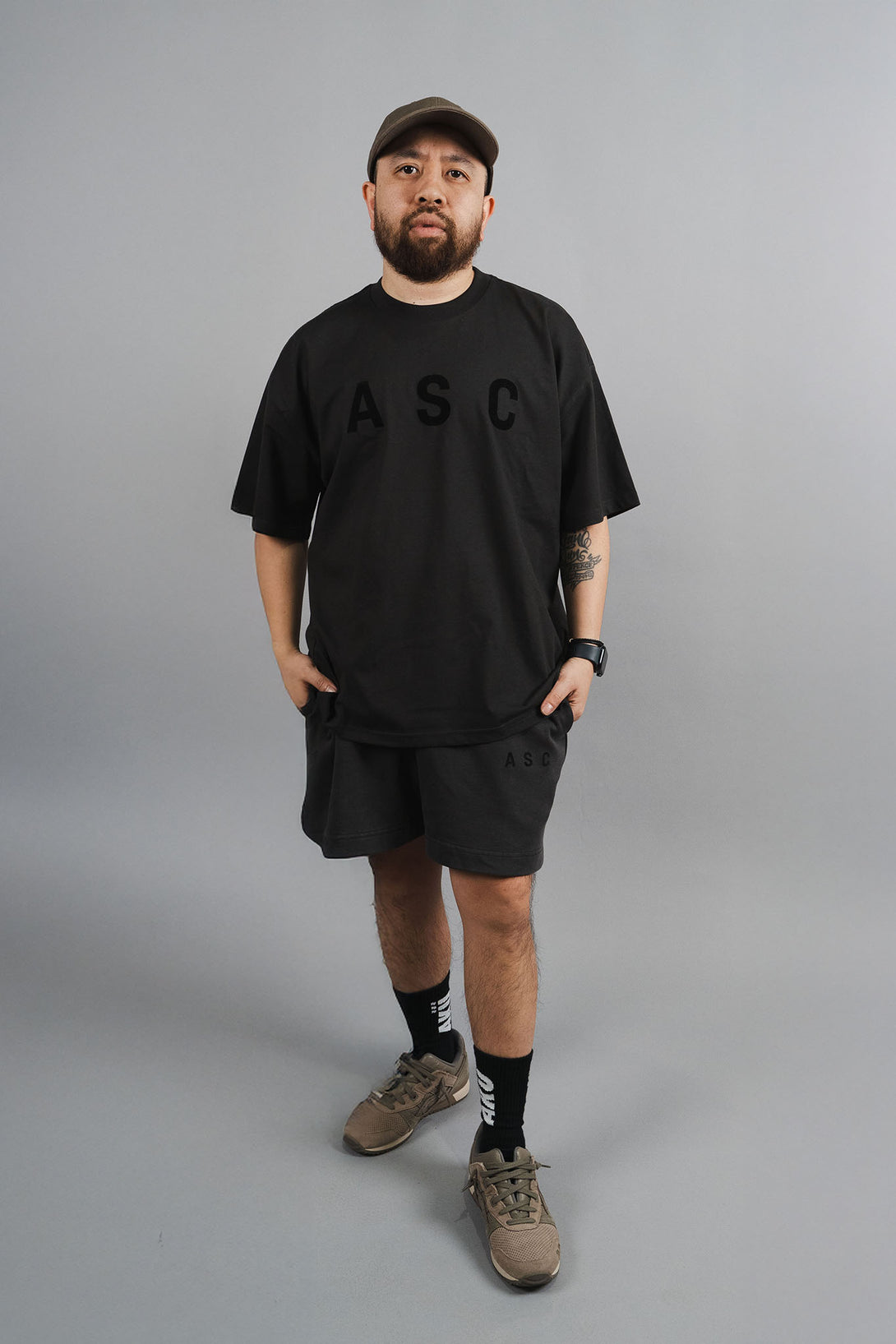 Oversized fit with drop shoulders, neck ribbing, cropped full length, shoulder to shoulder tape, double needle hems